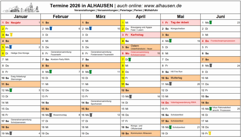 Damit in Alhausen jeder gut informiert durchs Jahr geht, bündelt dieser Dorfkalender alle wichtigen Ereignisse an einem Ort. Von Festen und Vereinsaktivitäten über kulturelle Angebote bis hin zu Versammlungen und besonderen Aktionen – hier findest du alles, was unser Dorfleben ausmacht und verbindet.