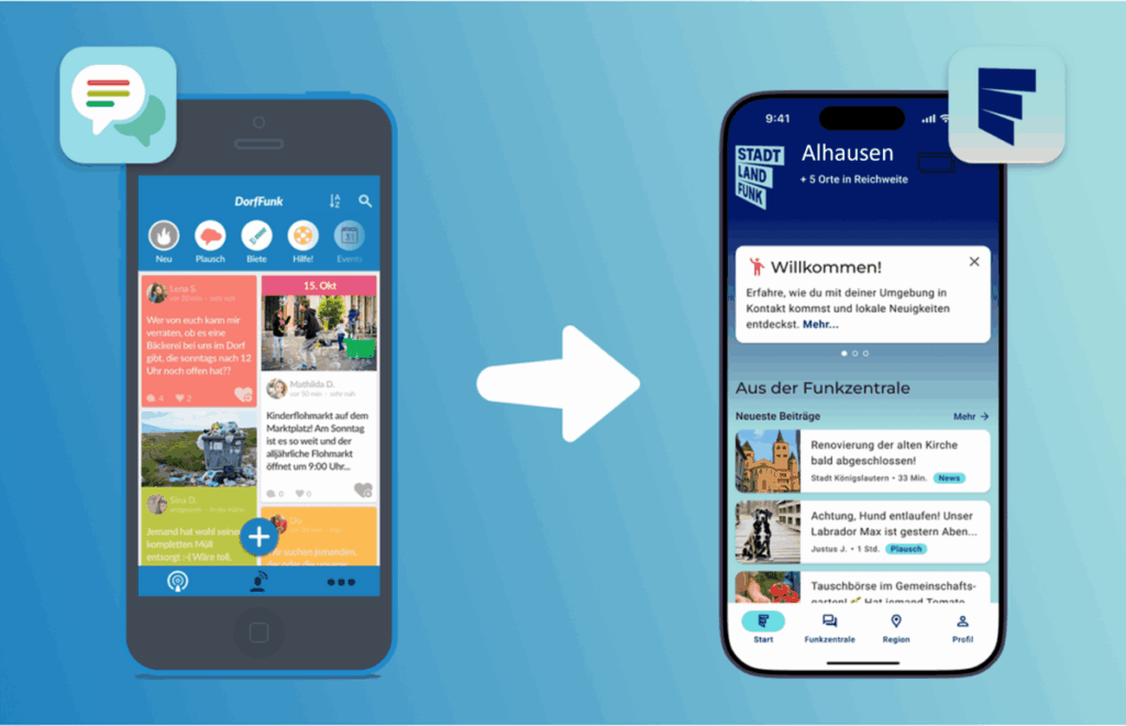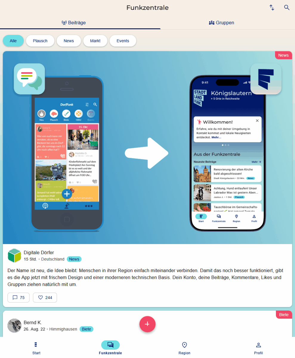 Der Name ist neu, die Idee bleibt: Menschen einfach und unkompliziert in ihrer Region miteinander zu verbinden. Genau das macht die bekannte App jetzt noch besser – mit modernisiertem Design, neuer technischer Basis und zusätzlichen Funktionen. Alle bestehenden Konten, Beiträge, Kommentare, Likes und Gruppen ziehen selbstverständlich automatisch mit um.