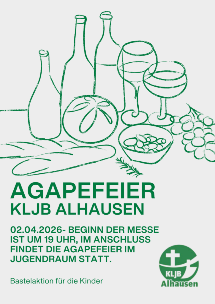 Herzliche Einladung zur Agapefeier für alle Kinder am 02.04.2026 nach der Messe, die um 19 Uhr beginnt. Im Anschluss treffen wir uns gemeinsam im Jugendraum, um den Abend gemütlich ausklingen zu lassen.
