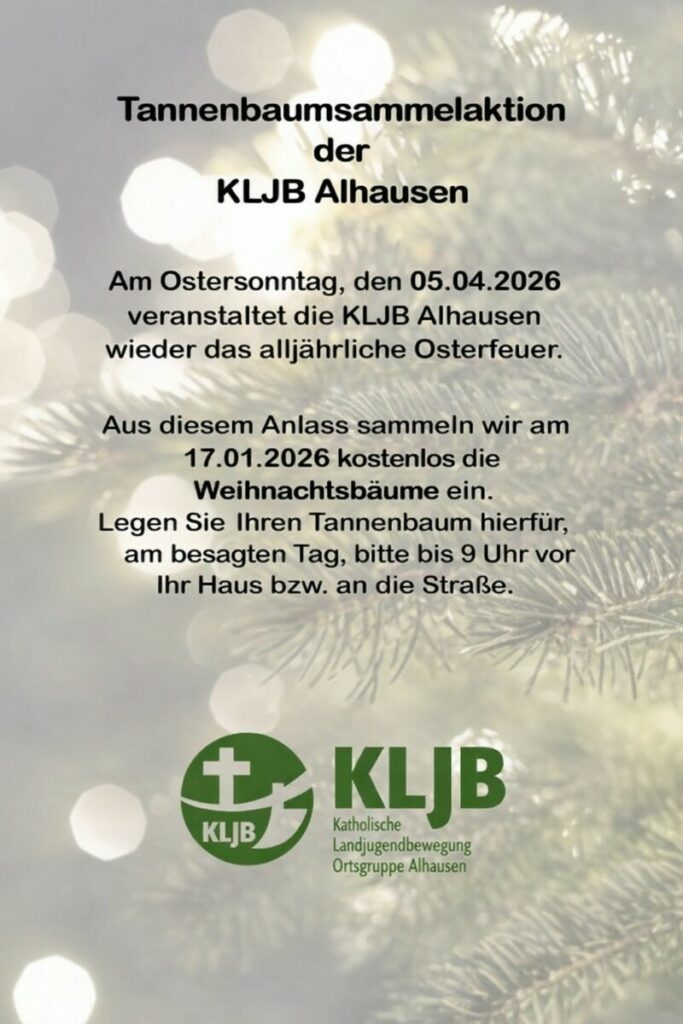 Auch in diesem Jahr sammeln die Jugendlichen der KLJB wieder die ausgedienten Tannenbäume ein. Die Sammelaktion findet am 17.01.2026 statt und ist kostenlos.